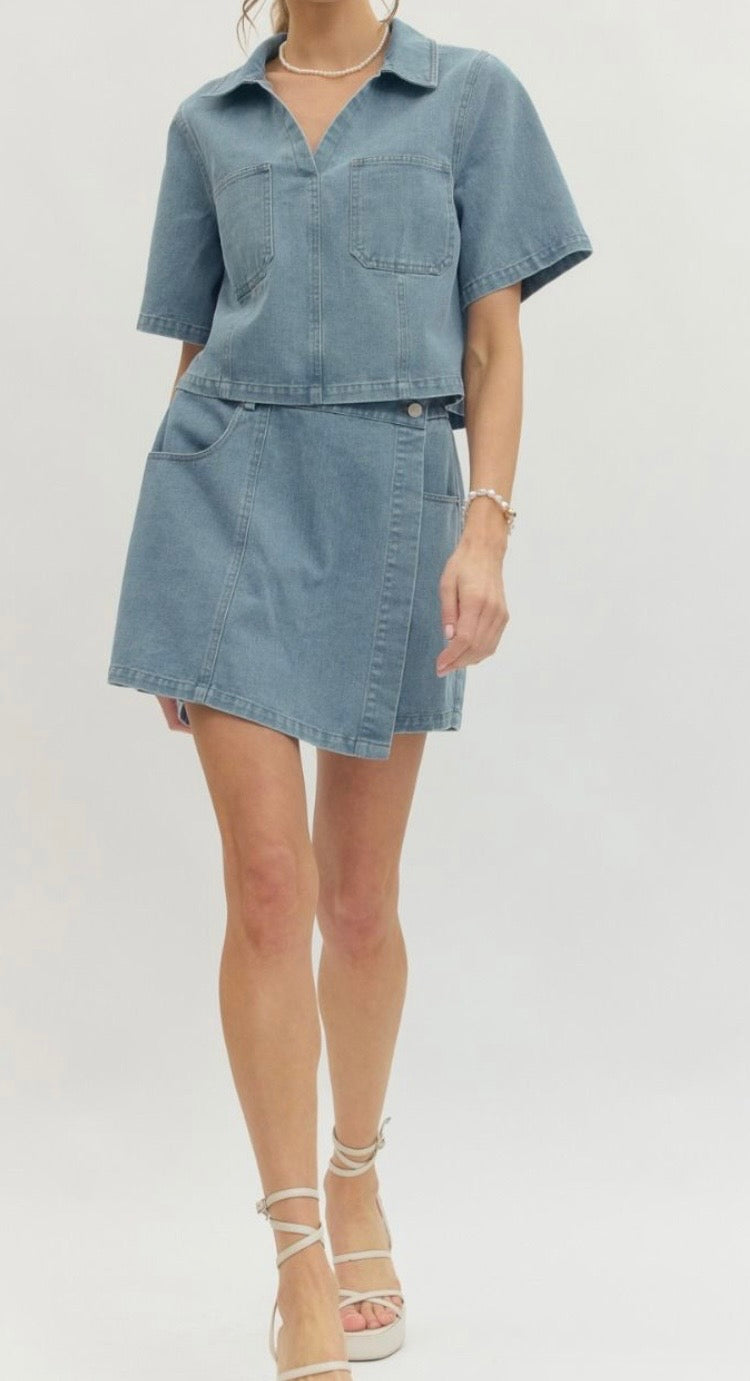 Solid short sleeve denim woven top featuring spread collar V-neck. Patch pockets at front. Back yoke with center pleat detail. Unlined. Woven. Non-sheer. Lightweight.